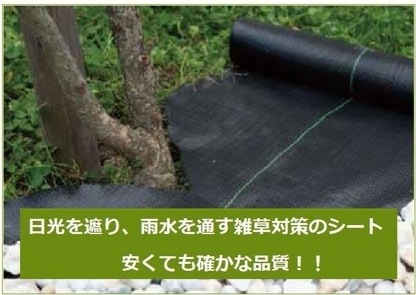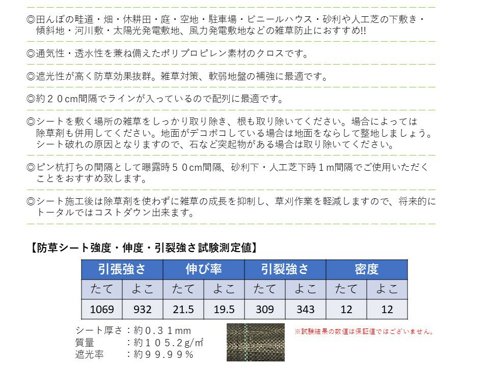 【防草シート】 ■商品説明: 田んぼの畦道・畑・休耕田・庭・空地・駐車場・ビニールハウス・砂利や人工芝の下敷き・傾斜地・河川敷・太陽光発電敷地、風力発電敷地などの雑草防止におすすめ!! 通気性・透水性を兼ね備えたポリプロピレン素材のクロスです。