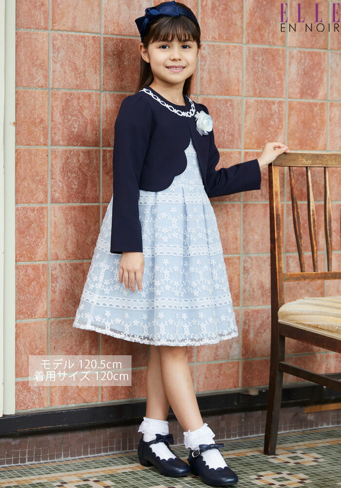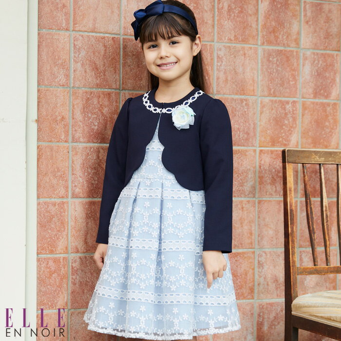 入学式 スーツ 女の子 スカラップボレロ×刺繍オーガンジーアンサンブル 115 120 130cm(4101-8308) ELLE en noir/エルアンノワール[子供服 キッズ フォーマル 小学生 卒園式 結婚式 発表会 ワンピース ネイビー 紺 花柄 刺] 2021年モデル