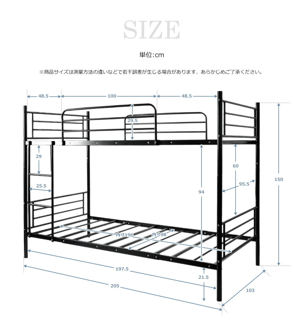 商品仕様 材質 水や汚れに強い粉体塗装スチール素材 商品サイズ 外寸:幅205x奥行103x高さ150cm(パイプ直径3.8CM/壁厚み1CM)ベッド内寸:幅196x奥行98cm(弊店シングルサイズマットレスピッタリ)一段から二段までの高さ:94cm保護フレームの高さ:29.5cm 梱包サイズ 幅110×奥行き42×高33cm 商品説明 ・梯子の位置を左右自由に移動できる・支柱をベッドフレームと連接ところに補強金具を増加する・水や汚れに強い粉体塗装を施した高い強度のスチールフレーム・置きやすく、狭すぎない窮屈感を感じさせない丁度よいサイズ感・睡眠中転落を防ぐ100*29.5cmサイドフレーム・分離利用可能のため、シングルベッドとしても利用できる・一段目のベッドの脚裏にはキズ防止のキャップが付き・ベッド下に21.5cm高さあり、お掃除もラクラク・通気性抜群の為湿気が原因のカビや虫対策・横揺れだけでなく、縦揺れにも強いベッドを作る 重量 約37kg 耐荷重 毎段約100kg カラー ナチュラル/ダークブラウン 商品番号 wf189135 生産国 中国 出荷形態 お客様組立品 備考 ※サイズ表記に1~2cm程誤差が生じる場合がございます。